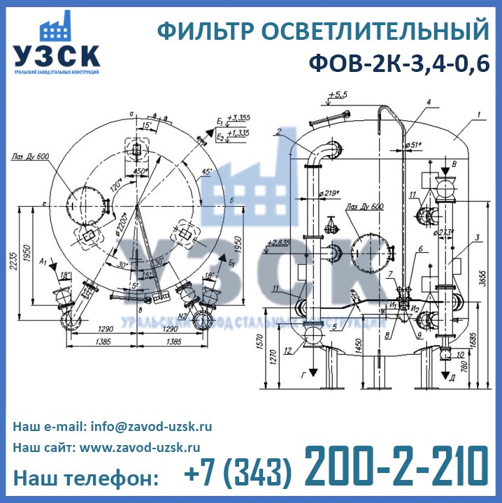 Изготовитель двухкамерных фильтров ФОВ диаметром 3,4 м с рабочим давлением 0,6 МПа — Уральский Завод Стальных Конструкций (УЗСК). Производство фильтров ФОВ2К выполняется из листовой стали. Подбор марки стали осуществляется в соответствии с условиями дальнейшей эксплуатации оборудования. Высокое качество продукции УЗСК подтверждено соответствующими документами, ознакомиться с которыми Вы можете в разделе «ДОКУМЕНТАЦИЯ» на нашем сайте. Завод УЗСК имеет все необходимое оборудование для изготовления двухкамерных фильтров ФОВ любой сложности, как типовых конструкций, так и по индивидуальным размерам и чертежам заказчика. Также наш завод располагает собственной лабораторией неразрушающего контроля и осуществляет гидравлические испытания готовой продукции на аттестованном гидростенде. При испытании фильтров ФОВ2К-3,4-0,6 дается пробное давление 0,9 Мпа (9,0 кгс/см2).